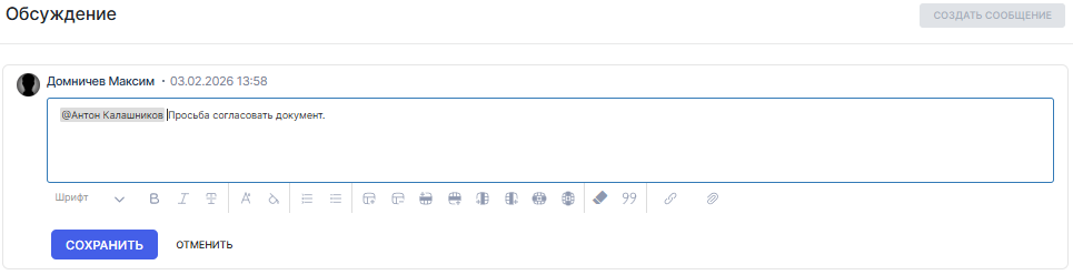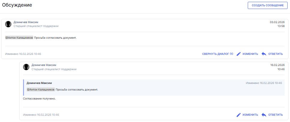 В карточке каждого документа доступна вкладка «Обсуждение». На данной вкладке любой сотрудник, у которого есть доступ к документу, может оставлять свои сообщения.