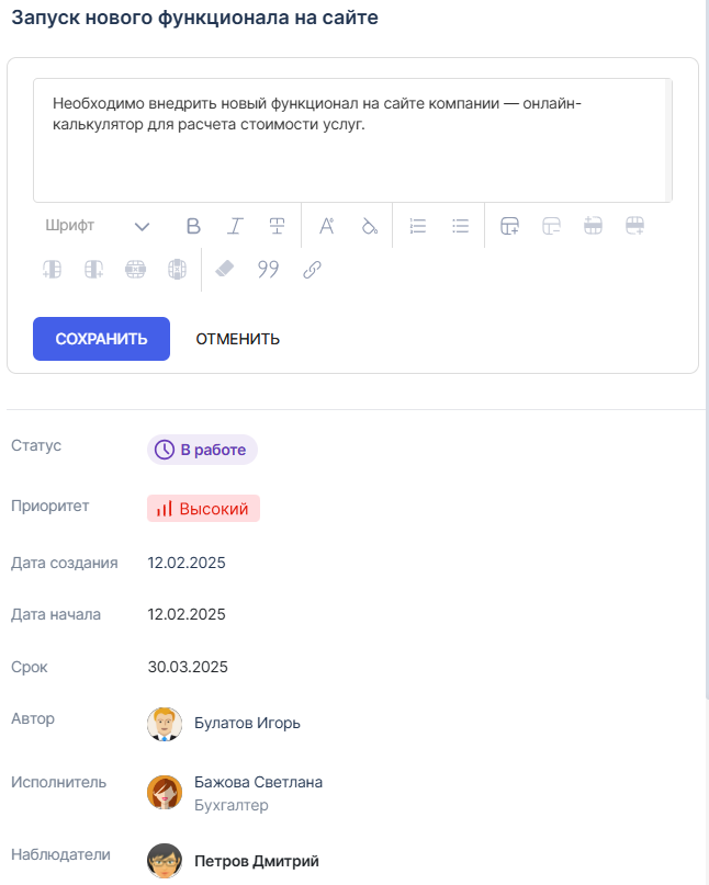 Нажмите на описание задачи. Отредактируйте текст. Чтобы сохранить изменения, нажмите кнопку Сохранить.