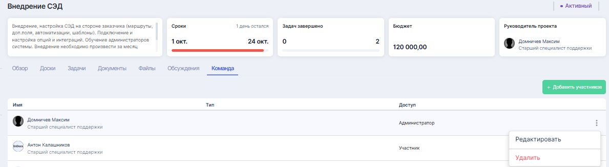 Важно! Управлять списком участников проекта может только администратор проекта или системы.